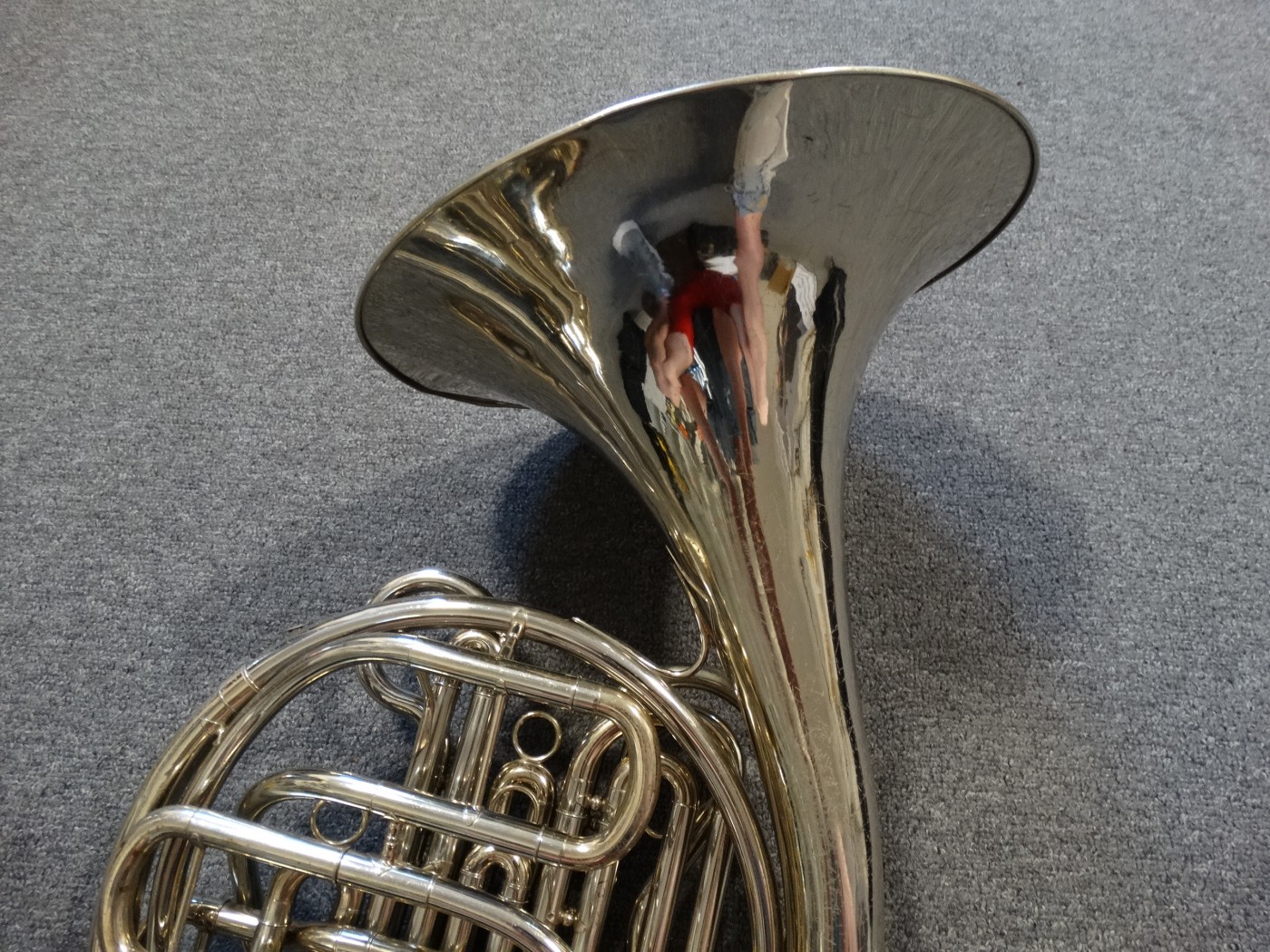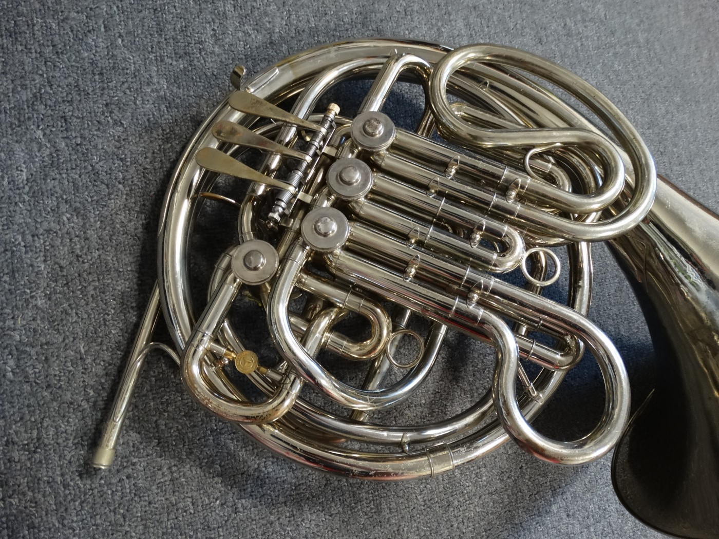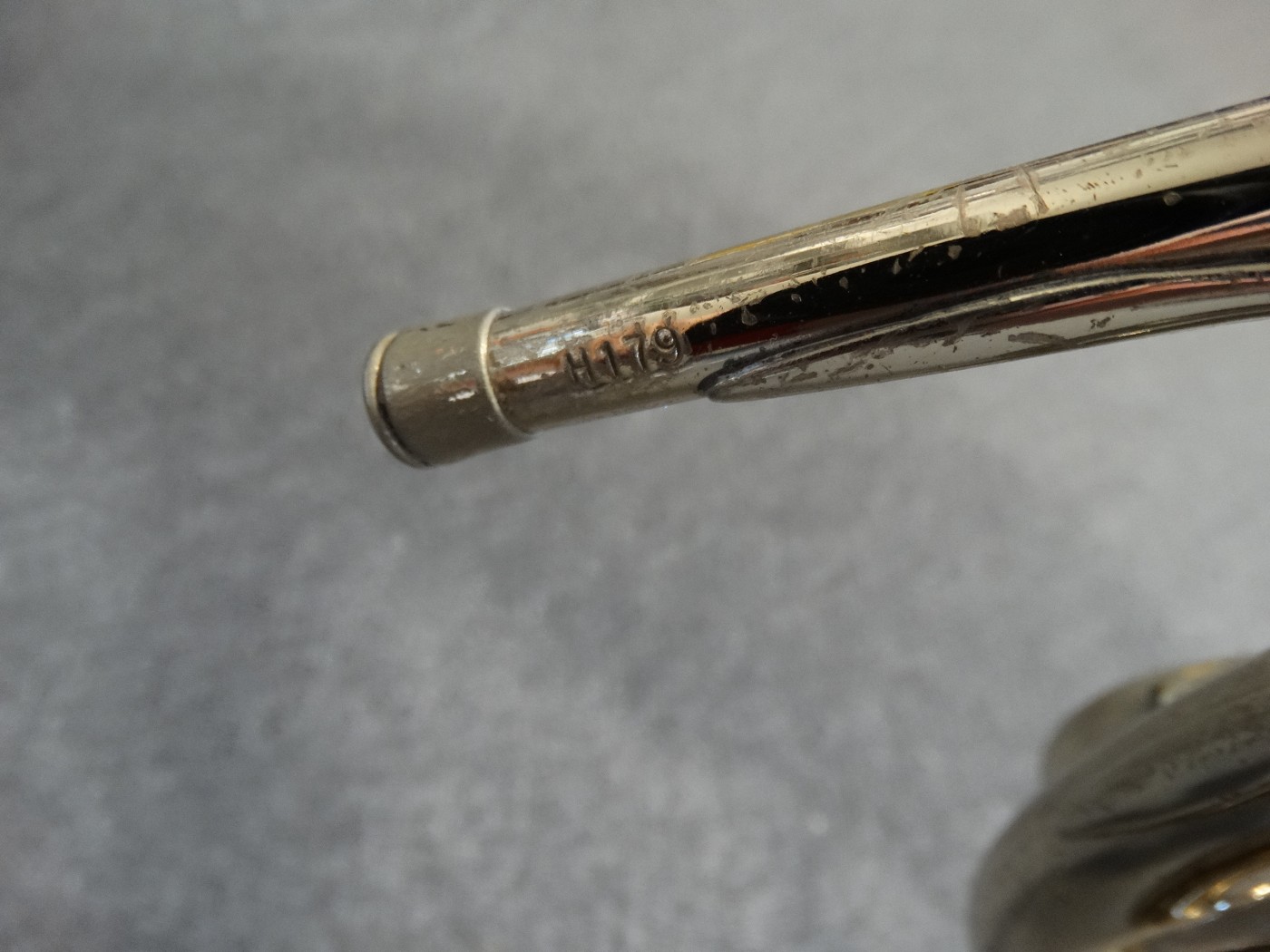 Waltornia posiada ślady po prostowaniu czary, minimalne ubicia i ślad po lutowaniu uchwytu na palec.