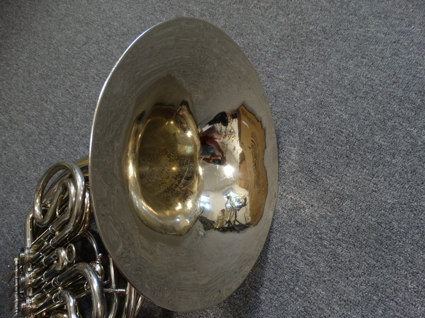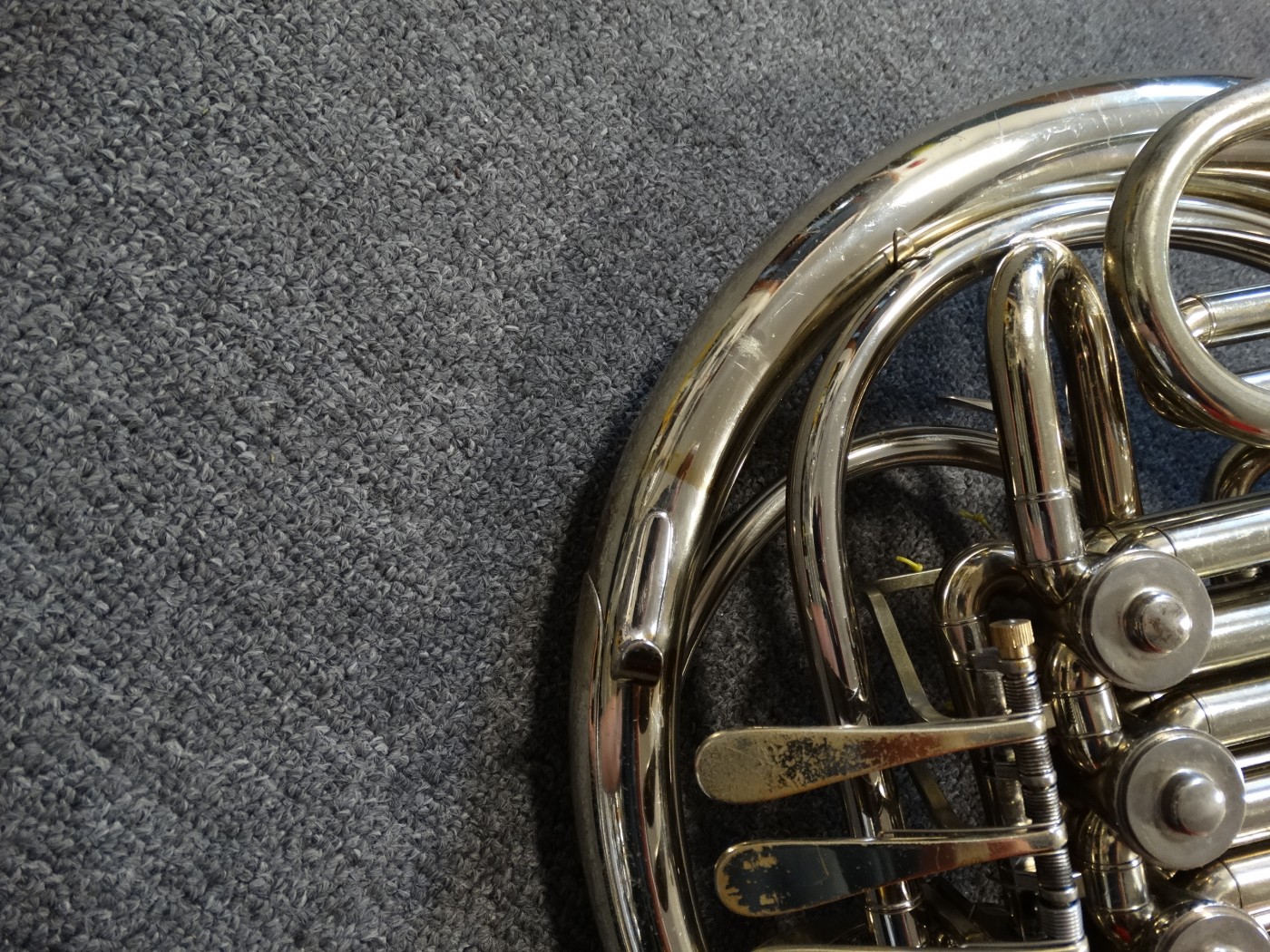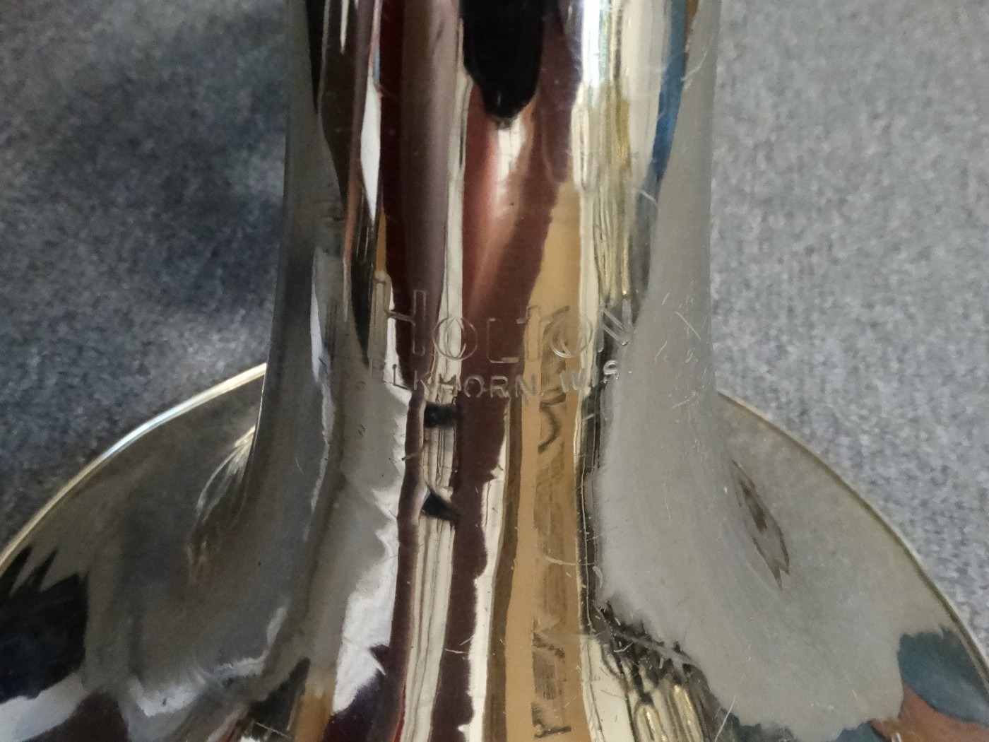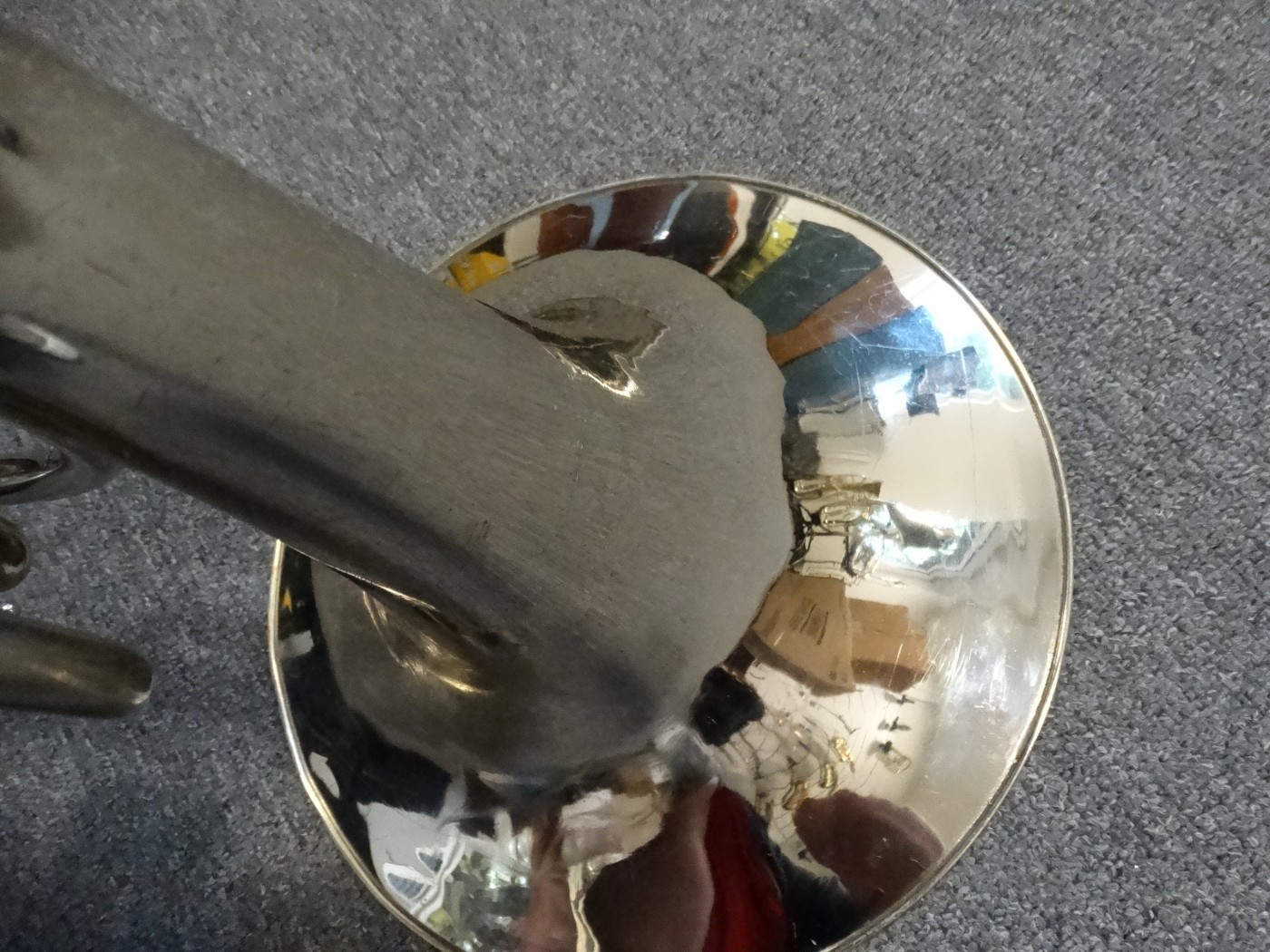 Waltornia posiada ślady po prostowaniu czary, minimalne ubicia i ślad po lutowaniu uchwytu na palec.
