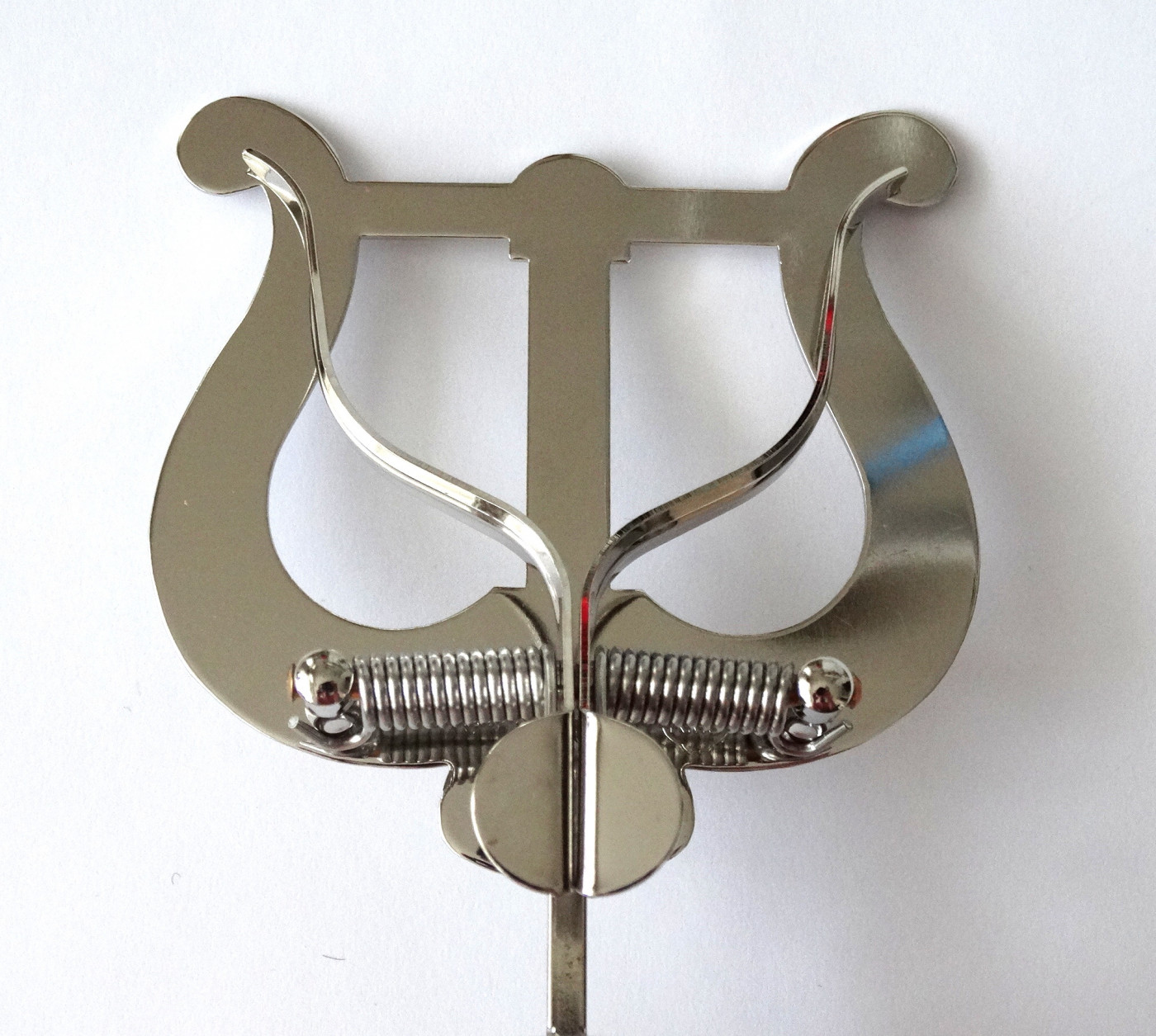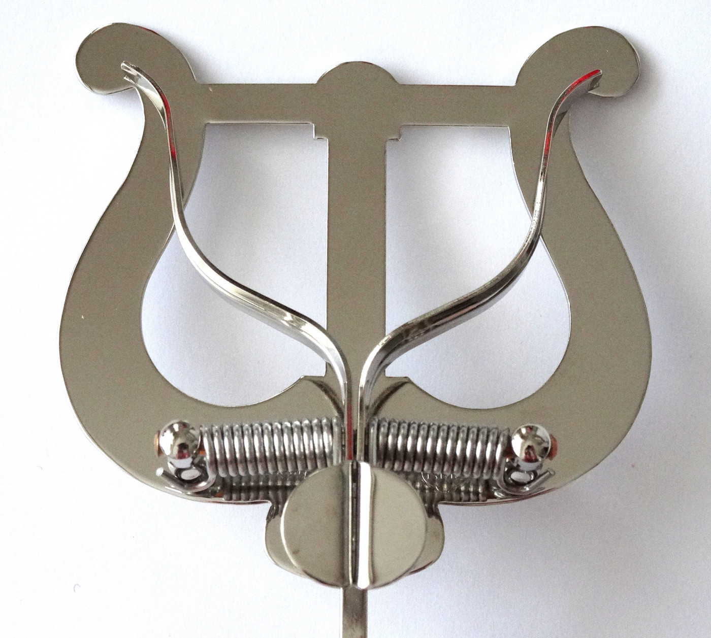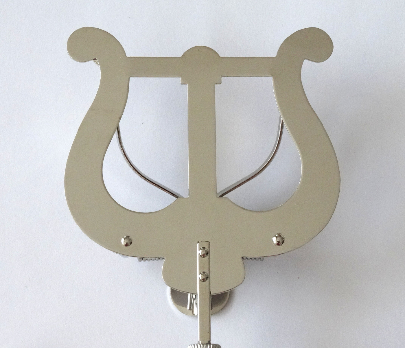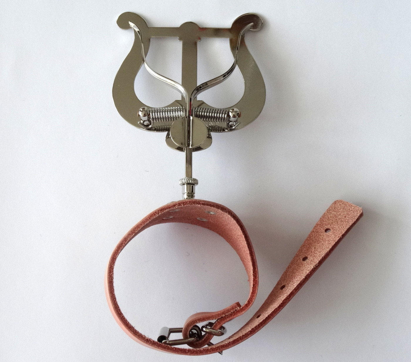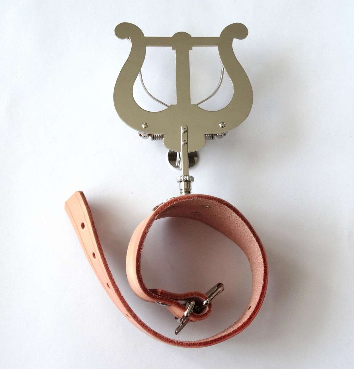 Niklowana lirka do fletu poprzecznego. Skórzany uchwyt montowany na rękę.