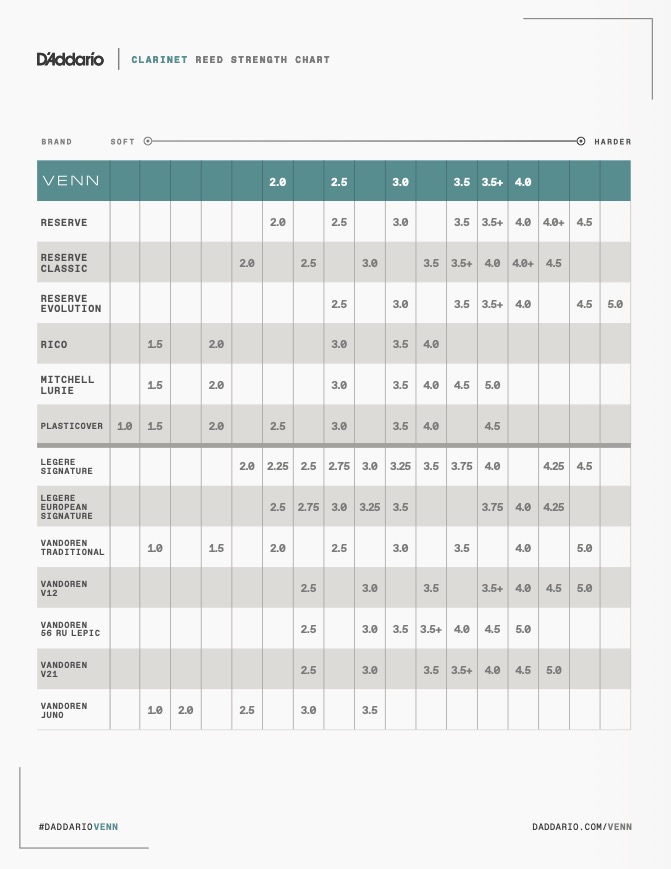 D'Addario VENN: zaawansowany syntetyczny stroik zbudowany z włókien polimerowych, żywicy i naturalnych elementów trzciny. Zaprojektowany, aby dać graczom korzyści płynące z syntetycznych stroików bez uszczerbku dla dźwięku i grywalności stroików trzcinowych.